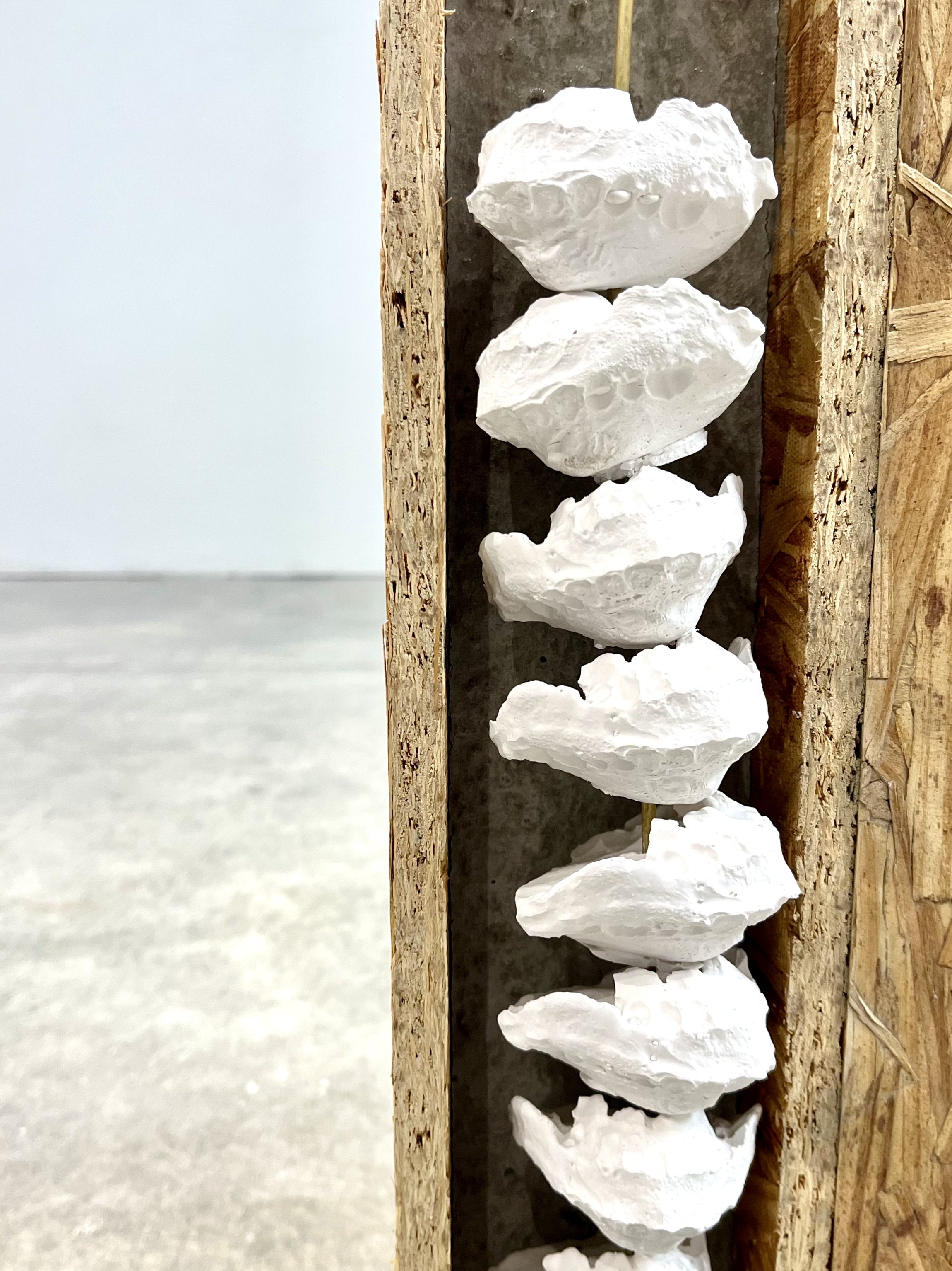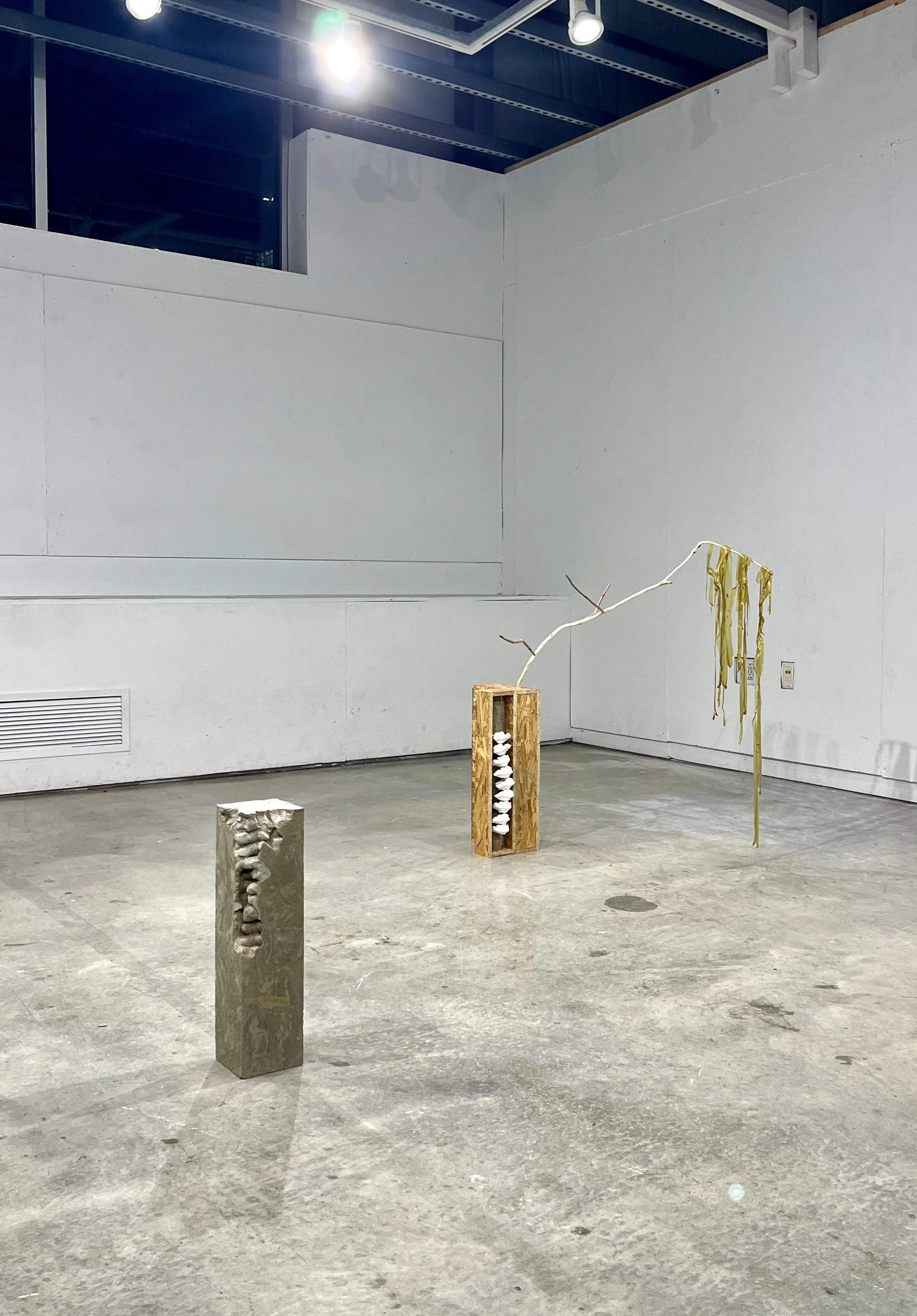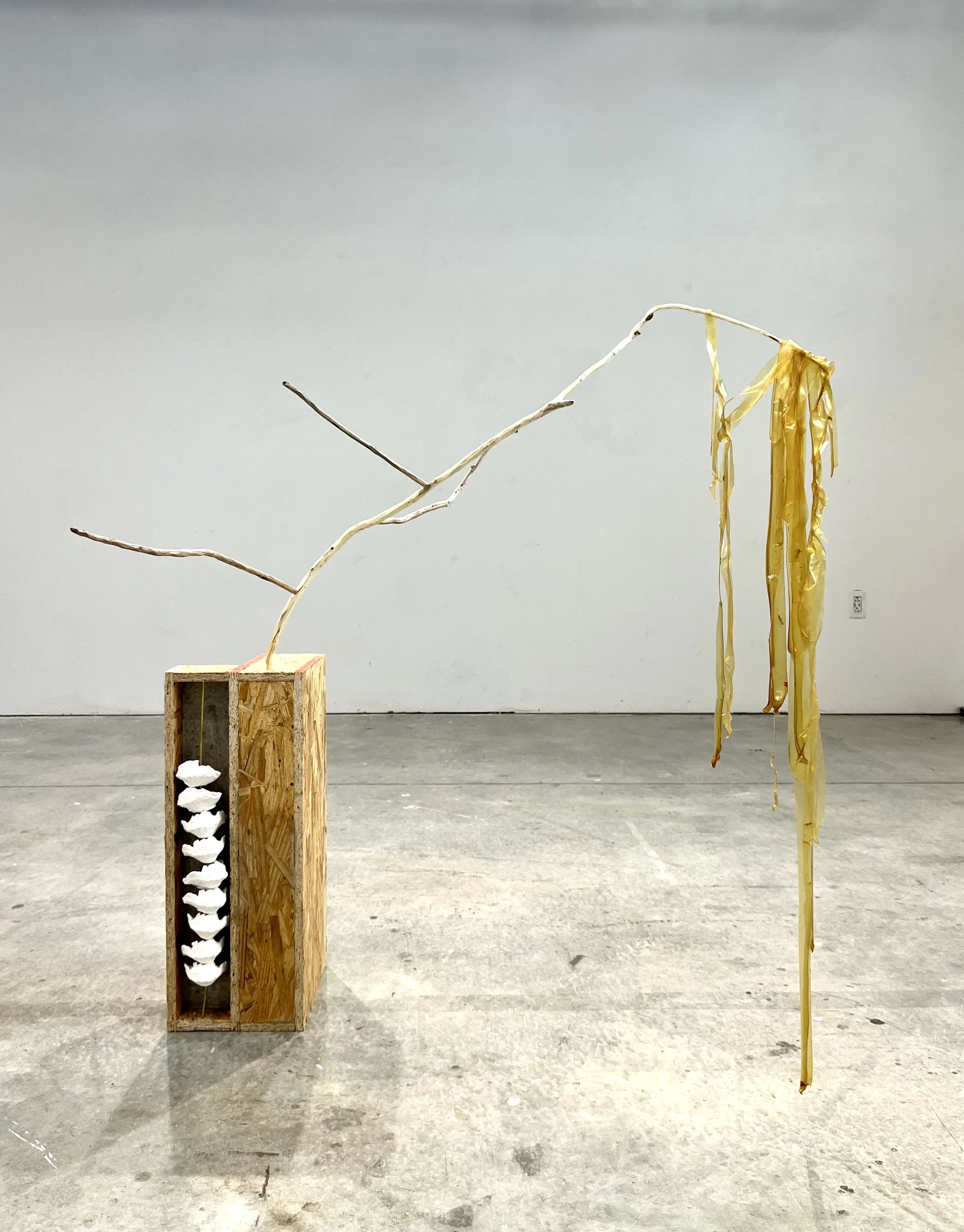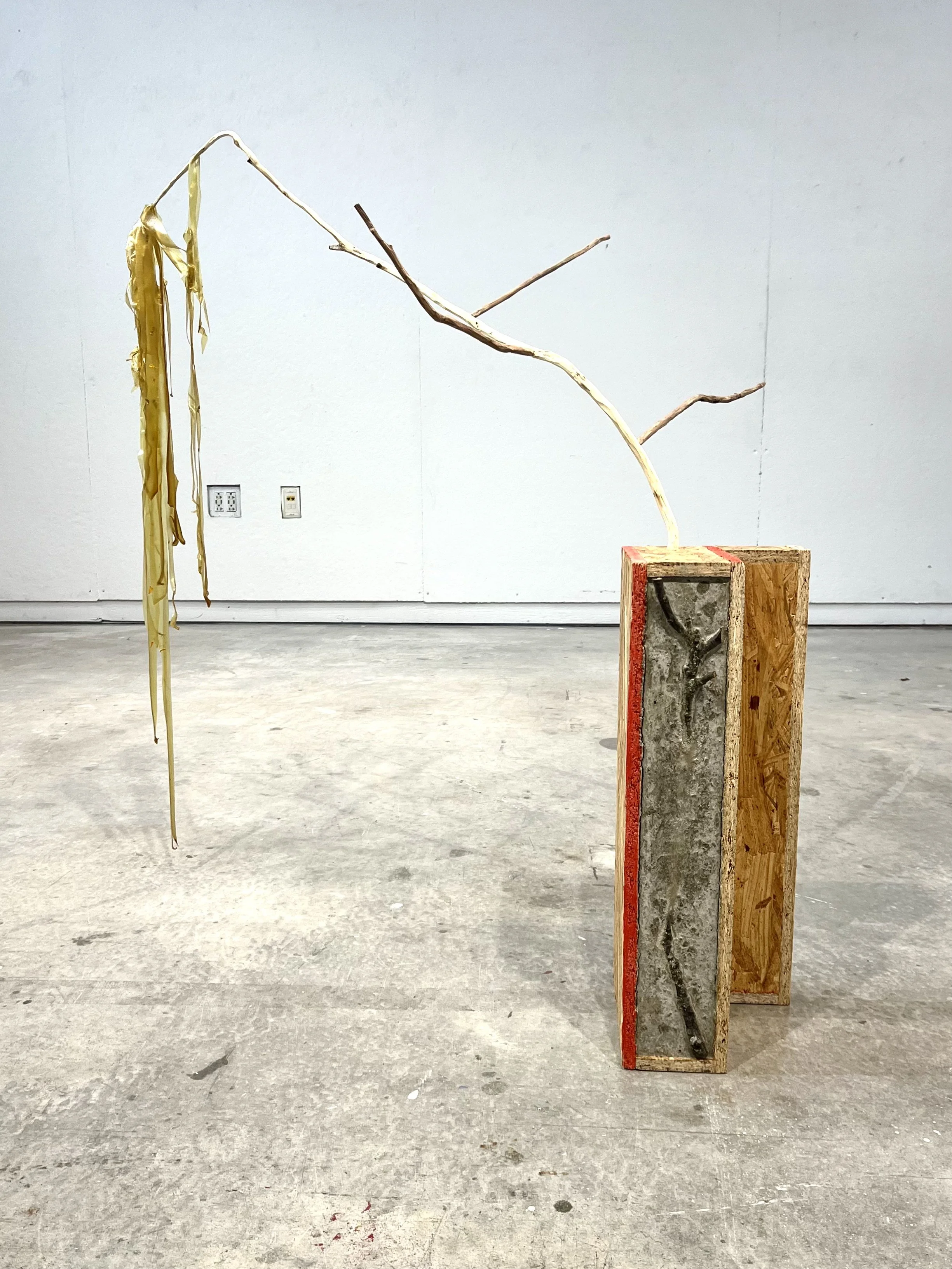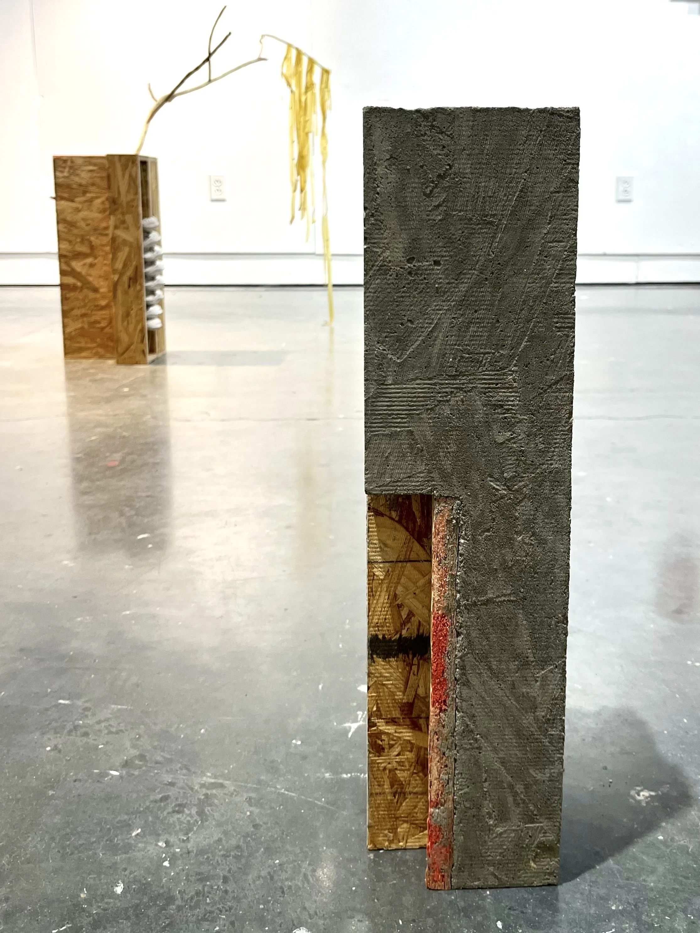 oriented strand board, concrete, sticks, plaster, brass, bioplastic made of glycerine and agar, marigold dye, marigold petals, insect exoskeletons