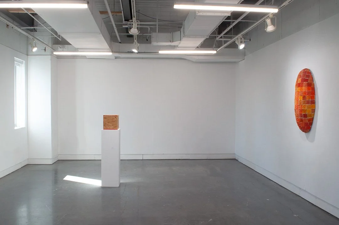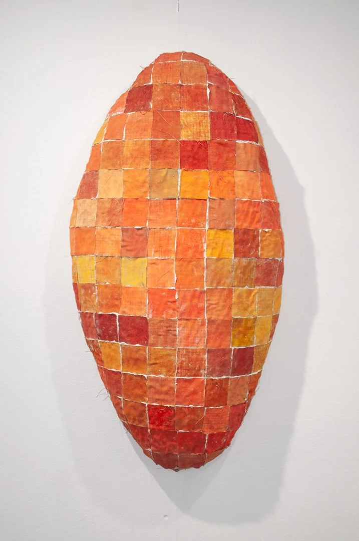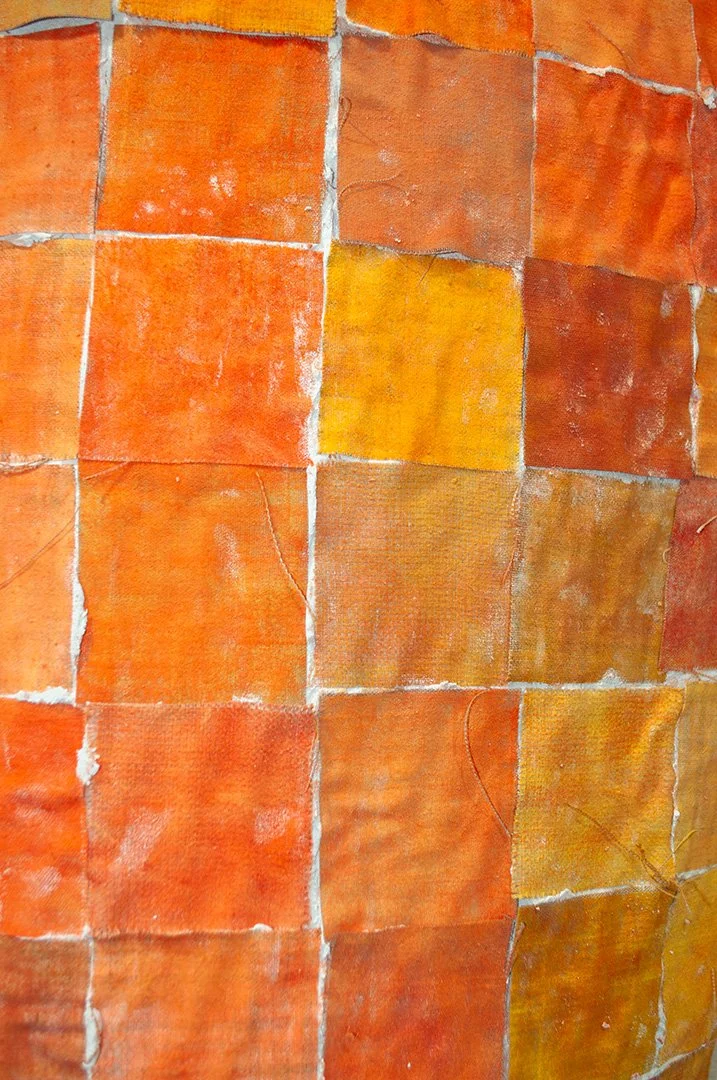 This piece is an exploration of form, color, and material. Fabric squares are pigmented and pressed with fingers into wet grout, arresting a flowing material into something concrete. The resulting grid evokes both quilting and tiling. The form seems to encapsulate something. A range of orange shades are a reflection of the world: construction sites, fall leaves, fluorescent plastic, red dirt, sunlight.