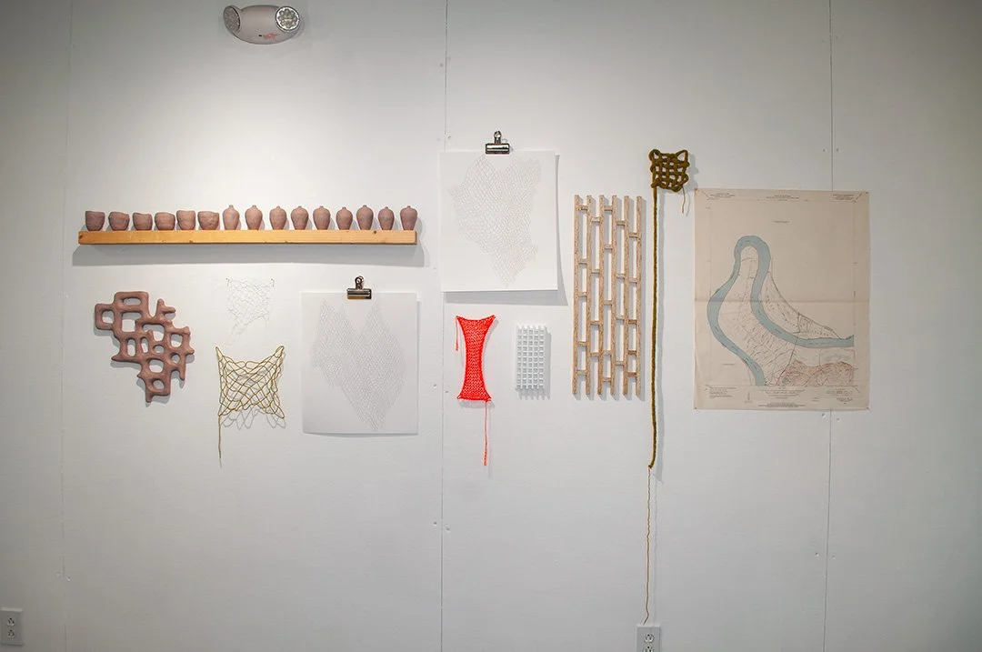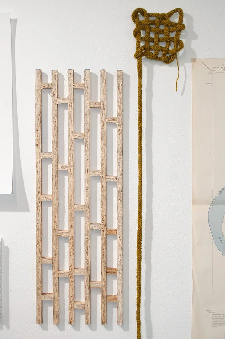 Clay, wool yarn, fishing line, paper, graphite, construction line, foam core, oriented strand board, map of Evansville